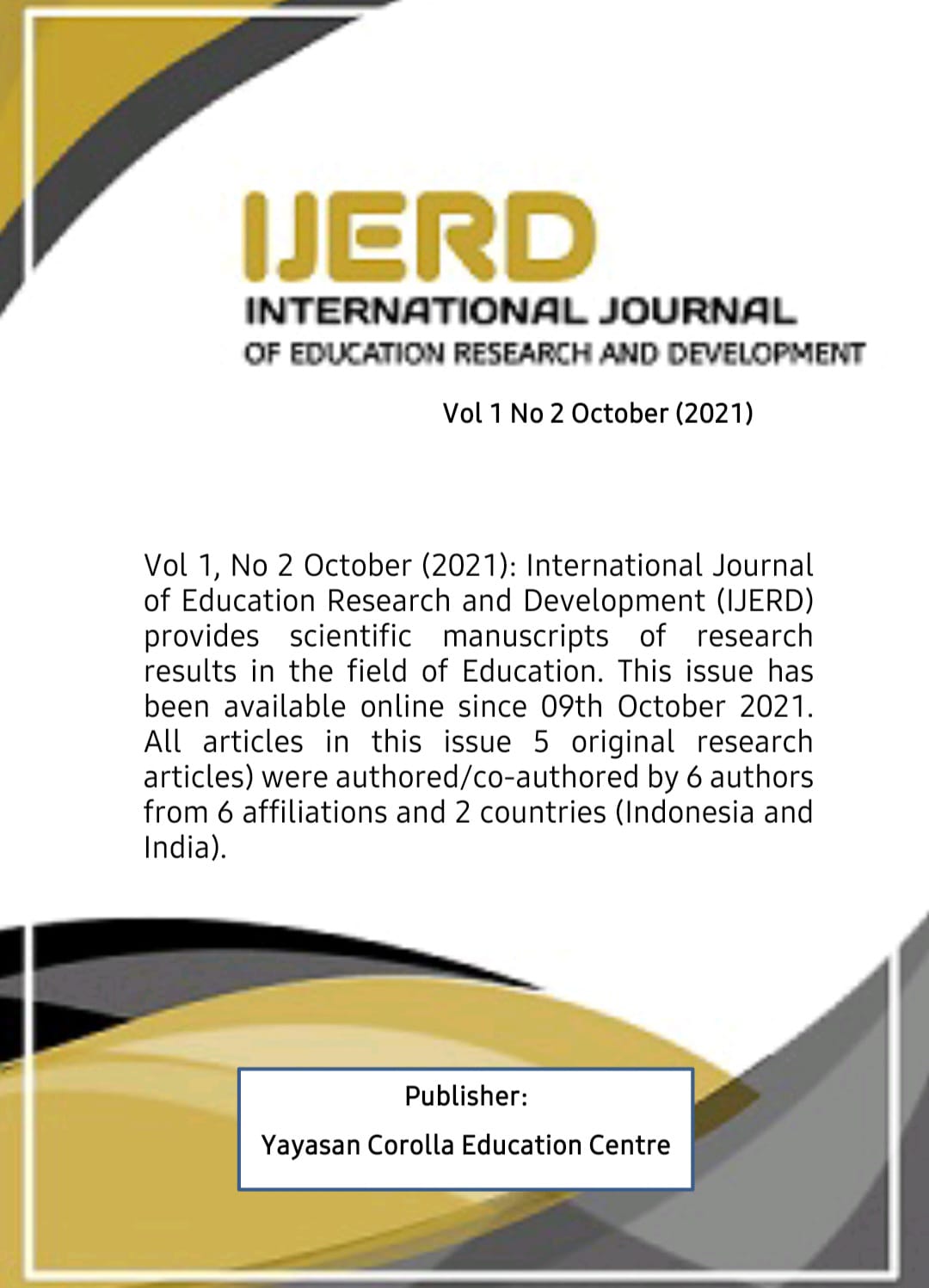 ##issue.vol## 1 ##issue.no## 2 (2021)Vol 1, No 2 October (2021): International Journal of Education Research and Development (IJERD) provides scientific manuscripts of research results in the field of Education. This issue has been available online since 09th October 2021. All articles in this issue 5 original research articles) were authored/co-authored by 6 authors from 6 affiliations and 2 countries (Indonesia and India).