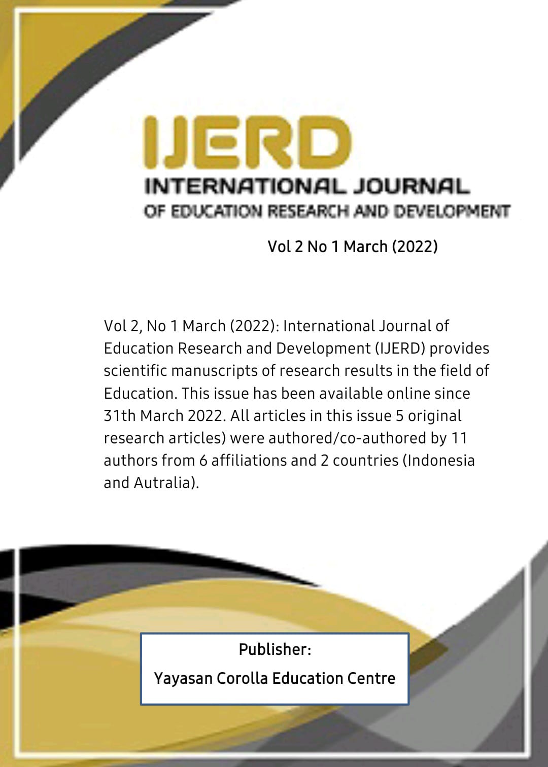 ##issue.vol## 2 ##issue.no## 1 (2022)Vol 2, No 1 March (2022): International Journal of Education Research and Development (IJERD) provides scientific manuscripts of research results in the field of Education. This issue has been available online since 31th March 2022. All articles in this issue 5 original research articles) were authored/co-authored by 11 authors from 6 affiliations and 2 countries (Indonesia and Australia).