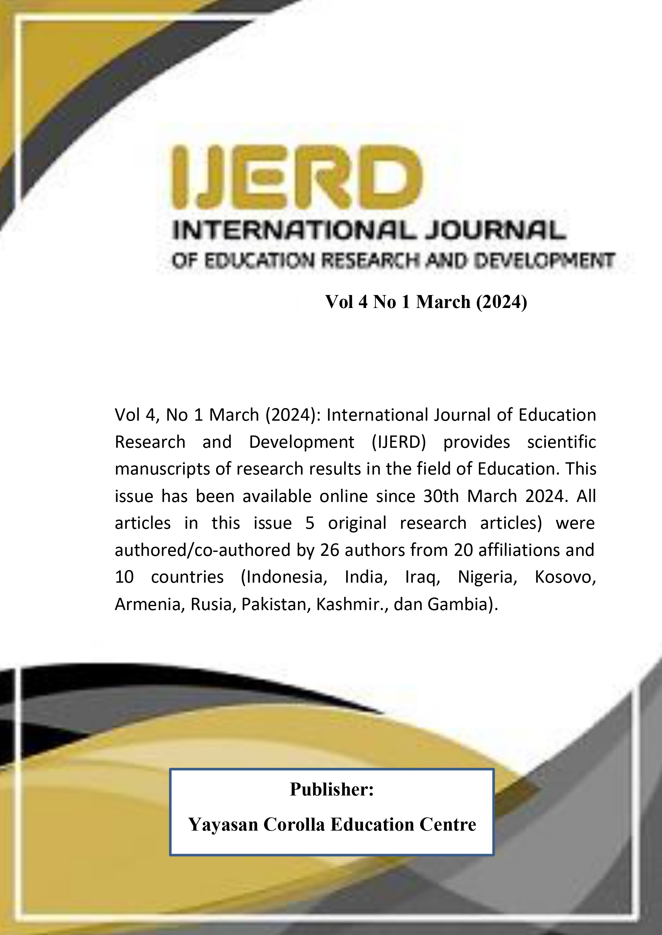 ##issue.vol## 4 ##issue.no## 1 (2024)Vol 4, No 1 March (2024): International Journal of Education Research and Development (IJERD) provides scientific manuscripts of research results in the field of Education. This issue has been available online since 30th March 2024. All articles in this issue 5 original research articles) were authored/co-authored by 26 authors from 20 affiliations and 10 countries (Indonesia, India, Iraq, Nigeria, Kosovo, Armenia, Rusia, Pakistan, Kashmir., dan Gambia).